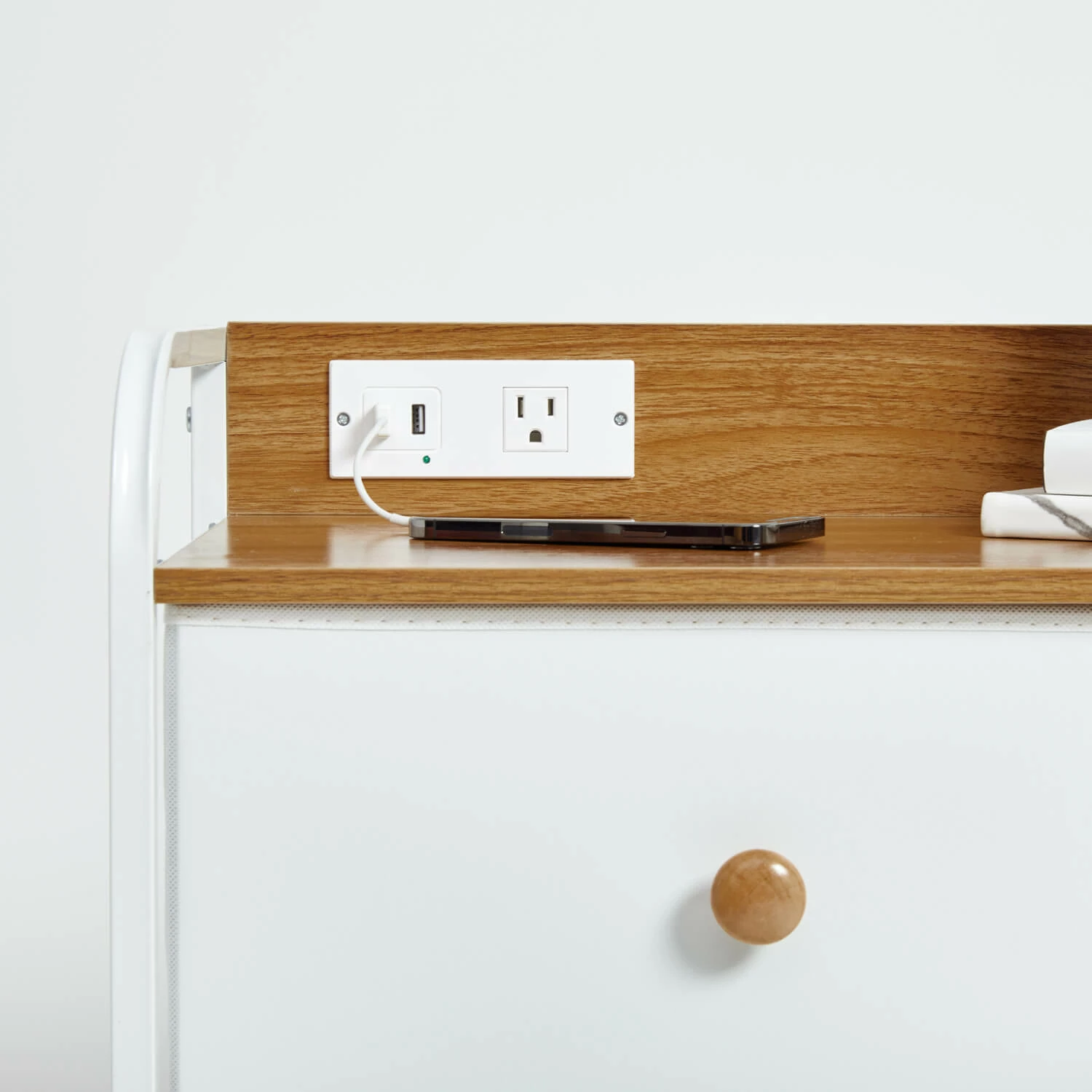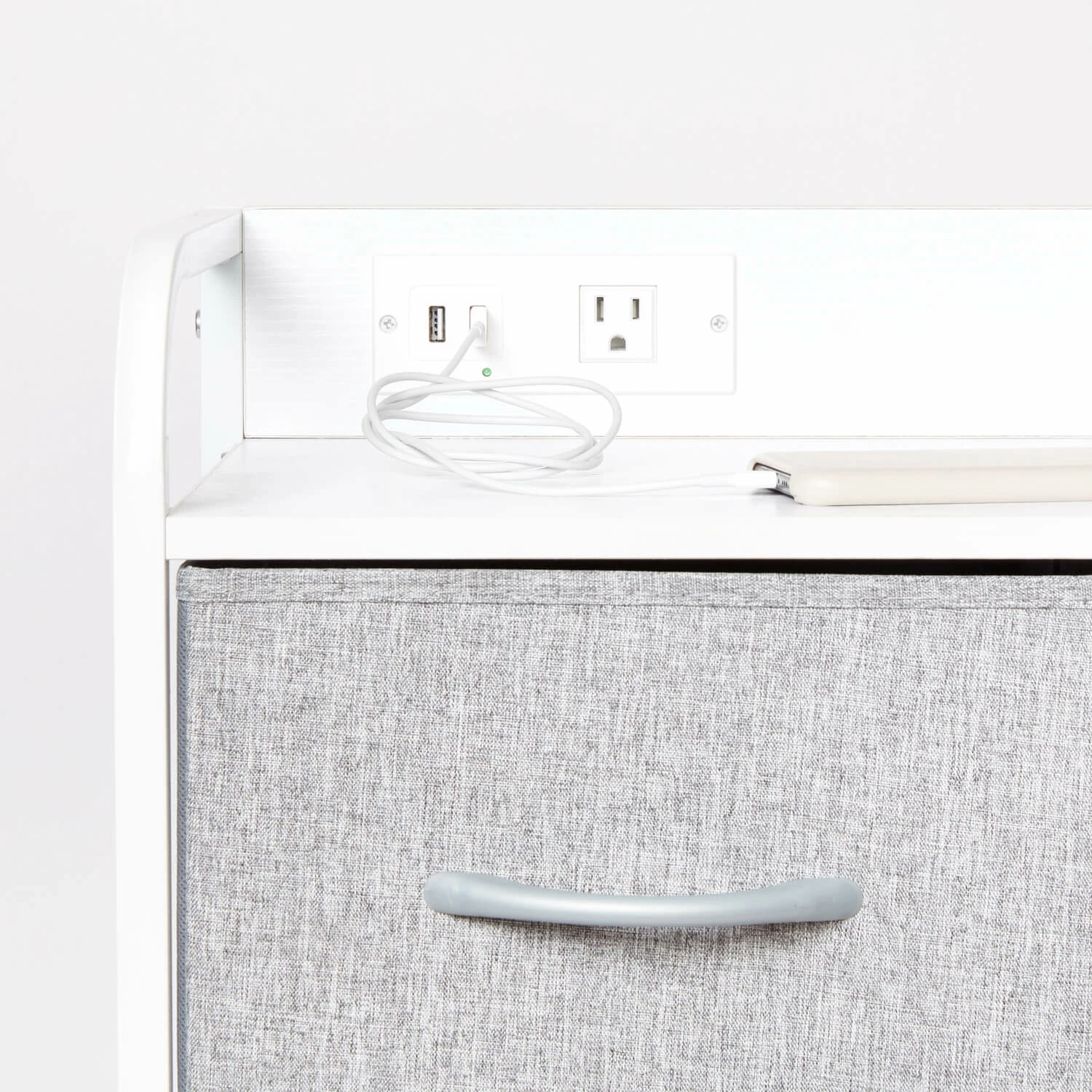 An all-in-one way to make sure everything in your room has a home and all your devices have a charge. Fill the fabric drawers with your bedside essentials and use the sleek faux-wood top shelf to put your items on display. This unit features two USB ports and one outlet to charge all of your devices. Instructions and hardware are included for hassle-free and quick installation.