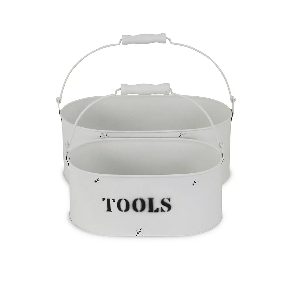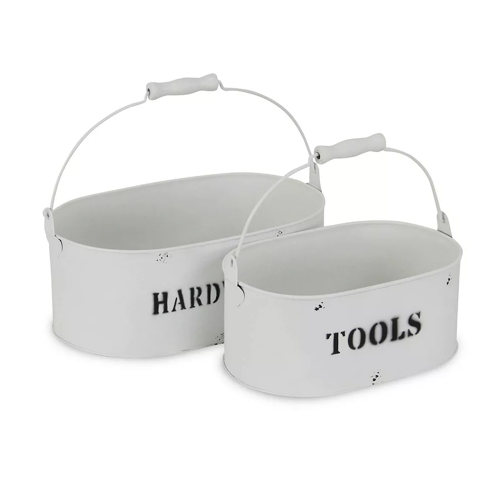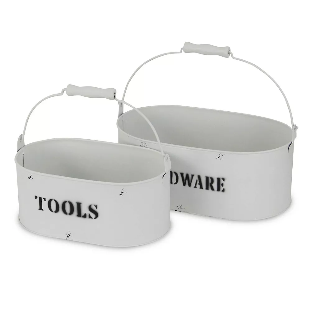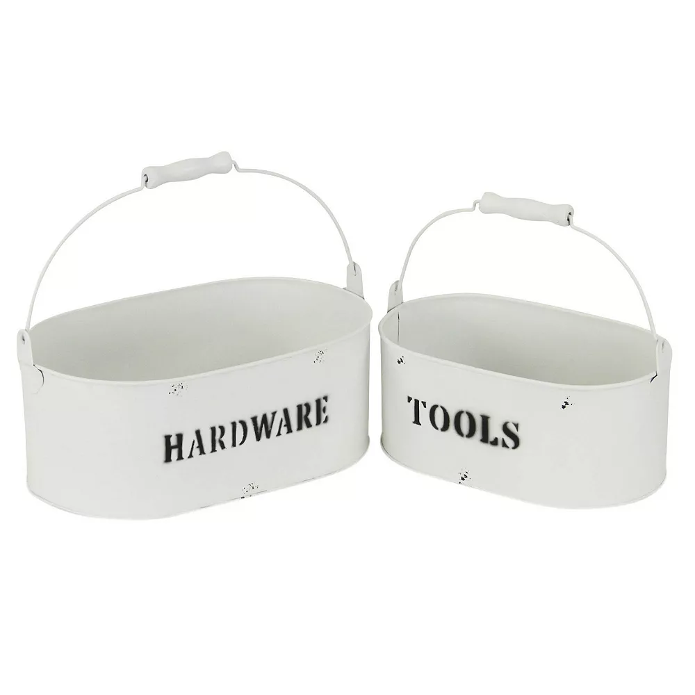 Enhance and organize your space with a multifunctional and stylish storage option. This piece features a nesting set of two storage bins made with a rustic white finished metal and hardware themed print. With its eye catching approach to organization, it will keep your area tidy and ready for guests.