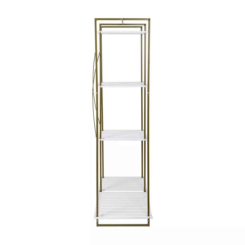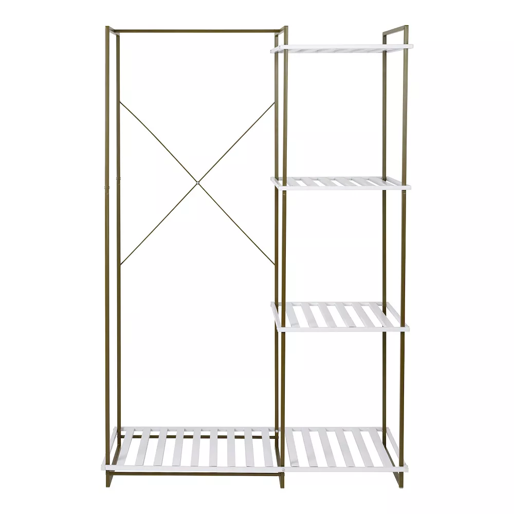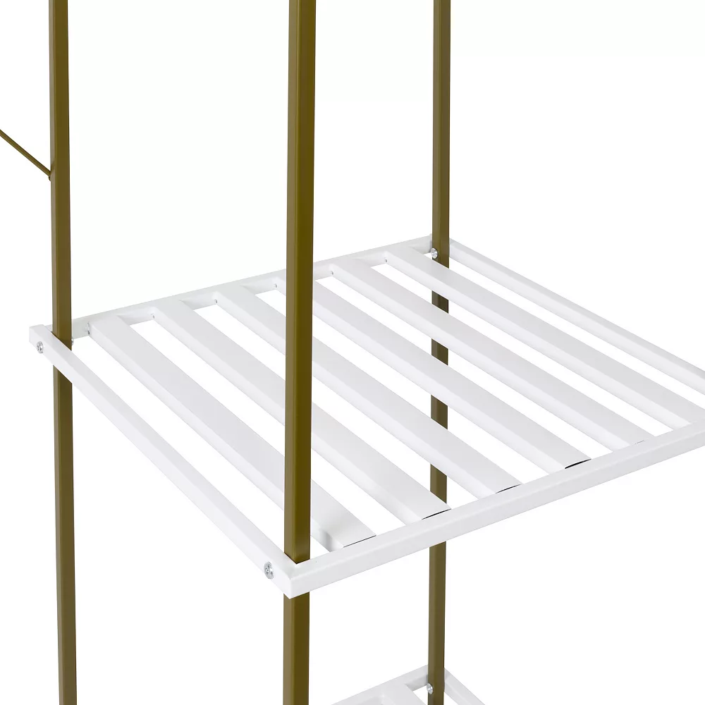 - Four slatted shelves keep go-to handbags, shoes, and accessories at hand. Clothes rack for lining up outfit combinations, hanging jackets, and more. Sturdy steel construction finished with color blocks of olive and white. Holds up to 85 lbs total (10 lbs on small shelves, 15 lbs on bottom; 40 lbs on rack).