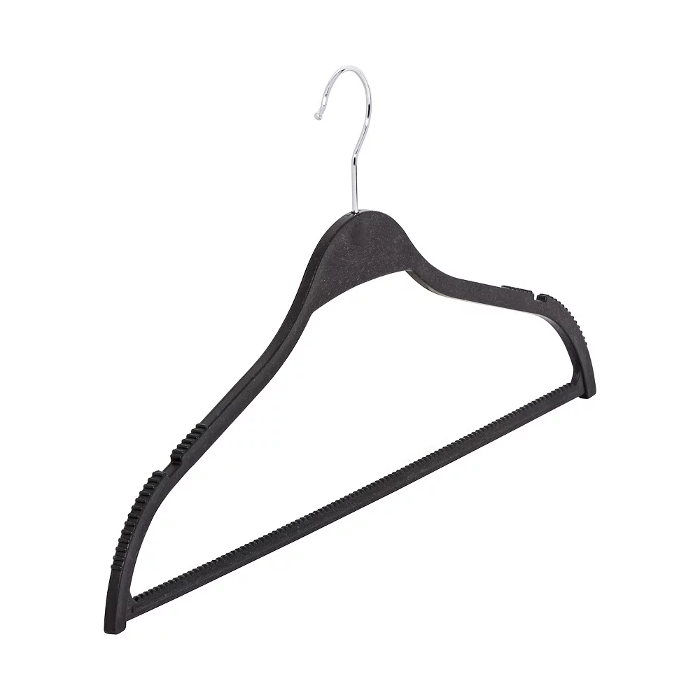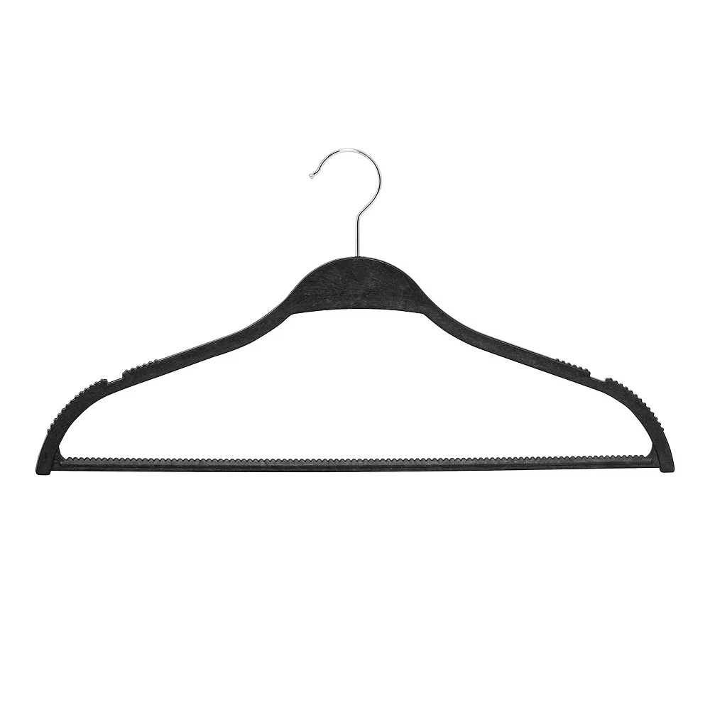 - This pack of 25 hangers is a great way to clean up a closet while doing some good for the planet by using plant waste. Their form factor is incredibly slim (a slight 0.2 inches wide, to be precise), which means your closet can be more full of the clothes you wear and less bloated from the hangers that hold them. Handy notches are cut into the contoured arms to catch straps from dresses, camisoles, and tanks. And with a classic black finish, this pack of natural slim hangers can quickly work to coordinate a whole closet.