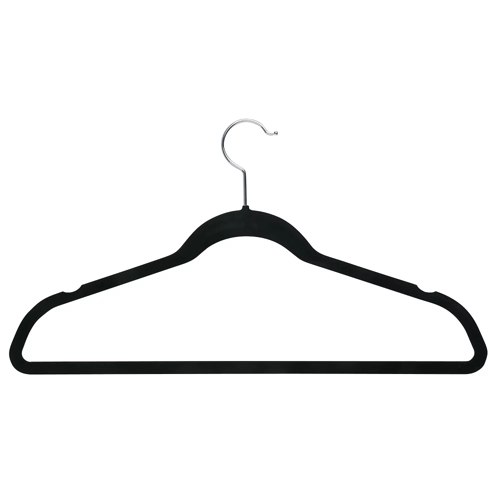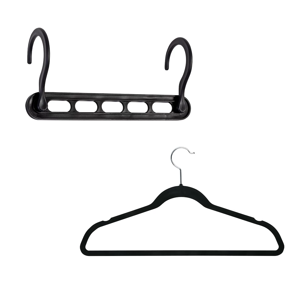 - Combo pack of coordinating hangers can quickly reorganize a closet. Each collapsible hanger holds up to 10 velvet hangers horizontally, 5 vertically. Velvet hangers’ nonslip coating keeps clothes off the closet floor.