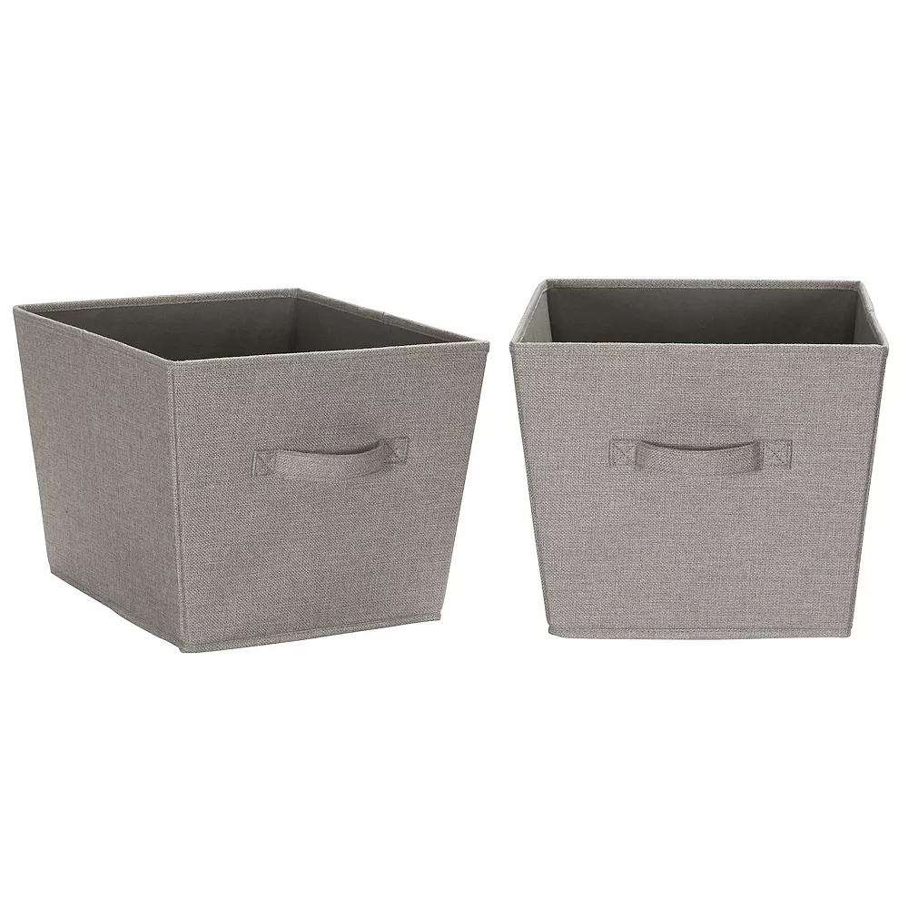 - The heather gray fabric will harmonize with any style room. Tapered sides create an interesting, eye-catching shape. Particularly suited to give depth and creativity to your shelving storage. Organize office supplies, clean linens, toiletries, knitting or sewing supplies, sweaters, lingerie and much more. Attached handles make them very portable. They collapse for slim storage when not in use,The natural fabric will harmonize with any style room. Tapered sides create an interesting, eye-catching shape. Particularly suited to give depth and creativity to your shelving storage. Organize office supplies, clean linens, toiletries, knitting or sewing supplies, sweaters, lingerie and much more. Attached handles make them very portable. They collapse for slim storage when not in use