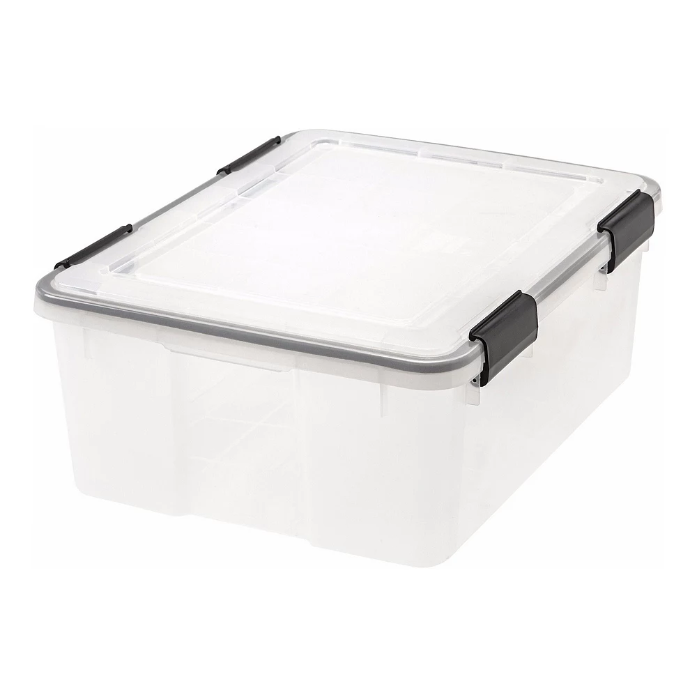Store your off-season clothes, linens, and other household goods in this IRIS USA 110400 30.6 Quart Weathertight Plastic Storage Box in Clear.