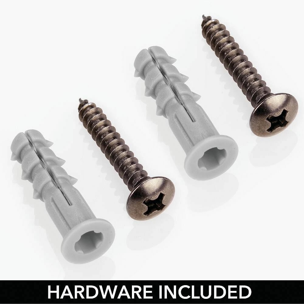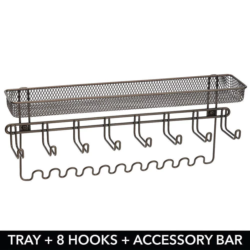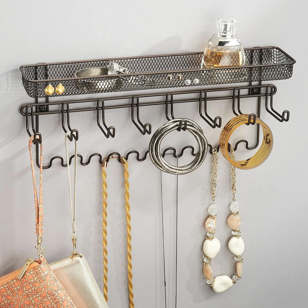 Keep your jewelry and small accessories neatly organized with this Wall Mount Closet Organizer from mDesign. Eight large hooks make it easy to store bracelets and larger costume jewelry while eleven smaller hooks hold necklaces. The attached basket holds rings, hair accessories, cosmetics, makeup, clutches, purses, hats, and more in one convenient spot. The organizer easily installs to closet, bathroom, or bedroom walls with the included hardware to maximize storage. mDesign – Solutions for Home. Solutions for Life.