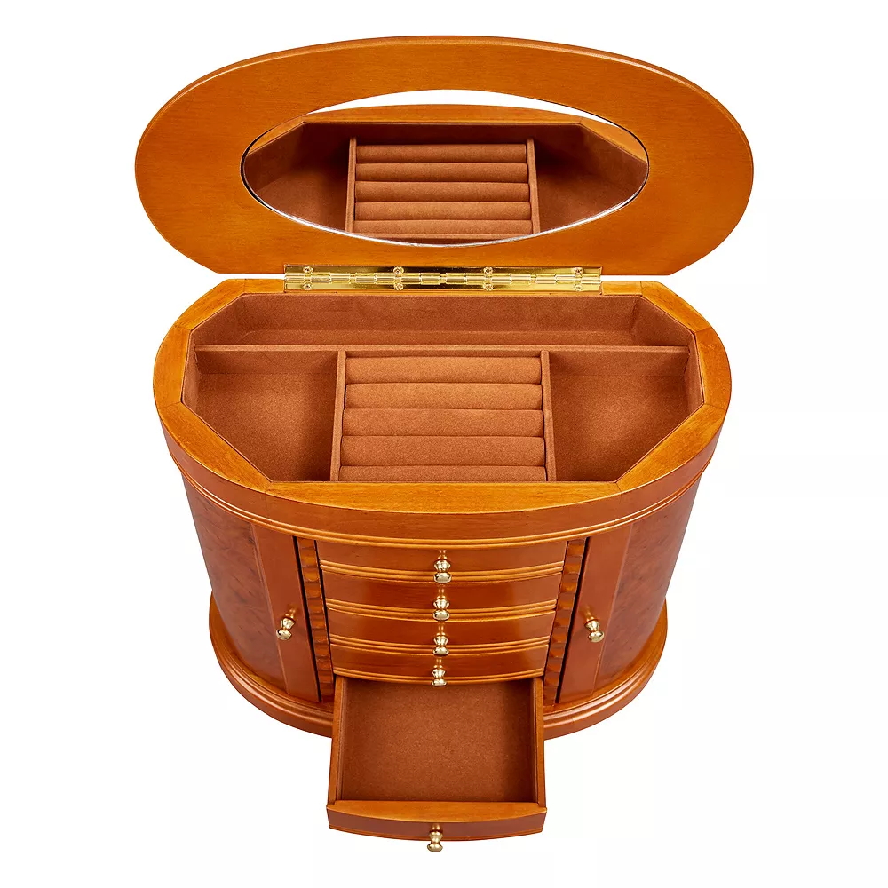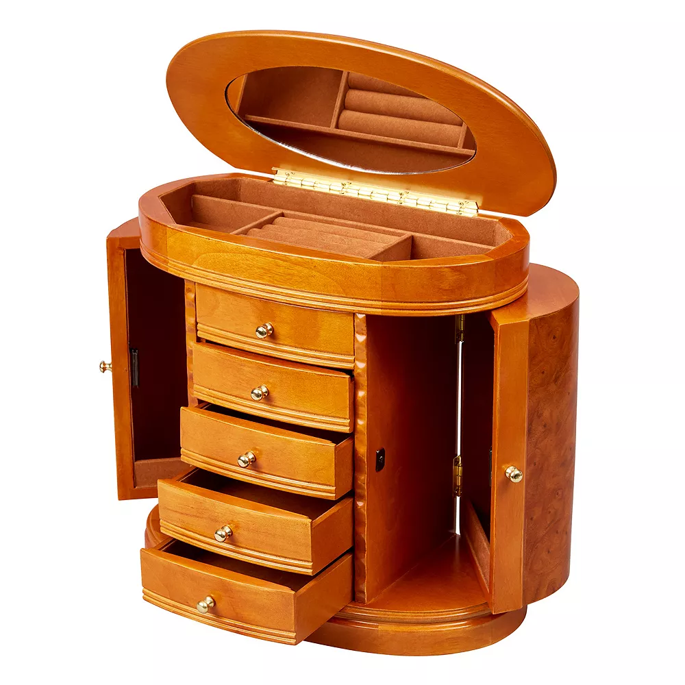 - Burlwood walnut finish wooden jewelry box, and hand lined ginger sueded fabric