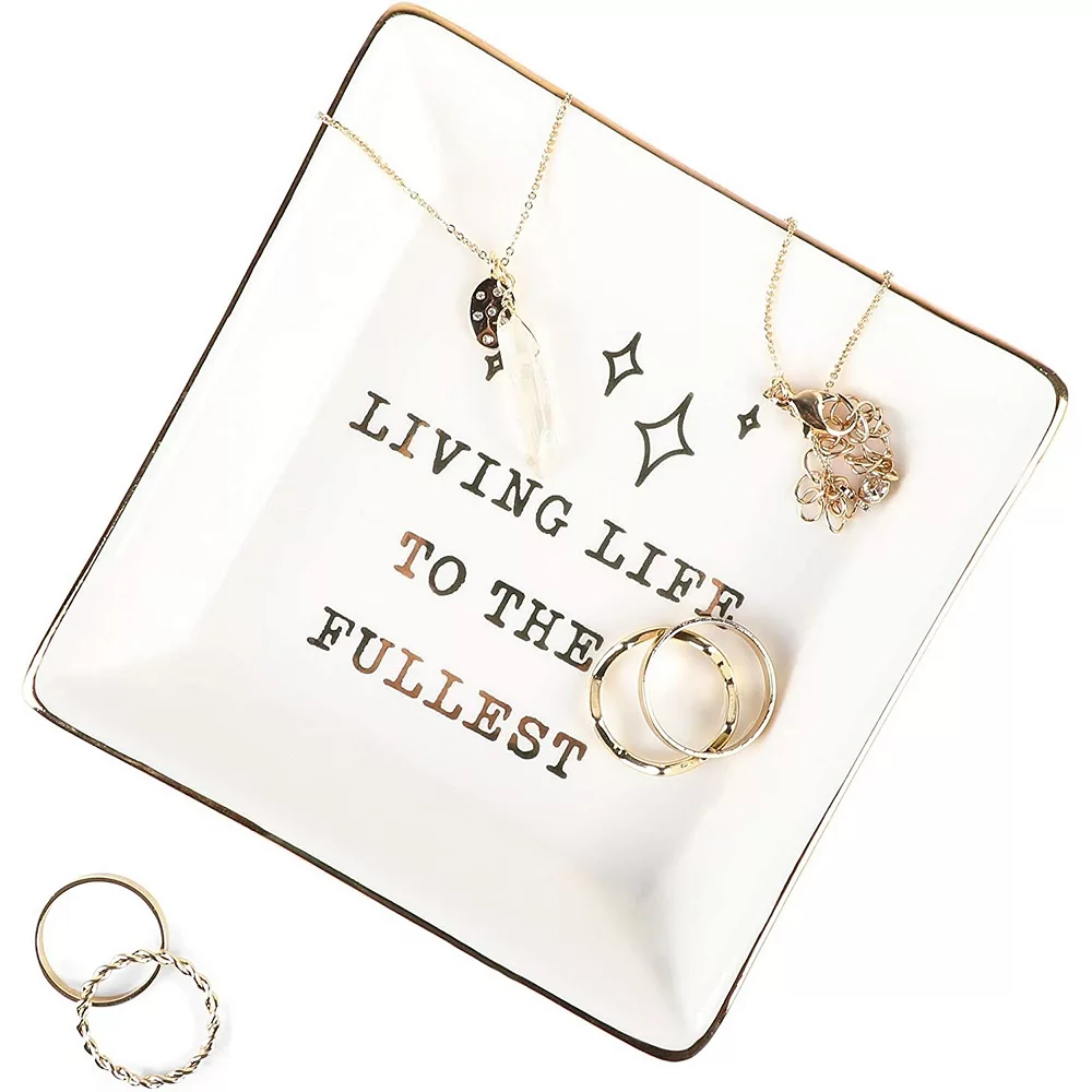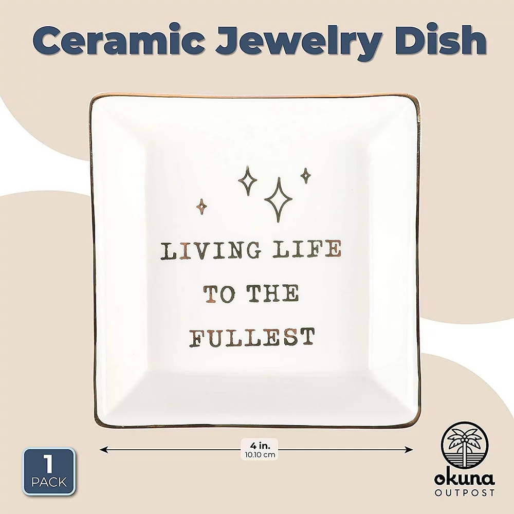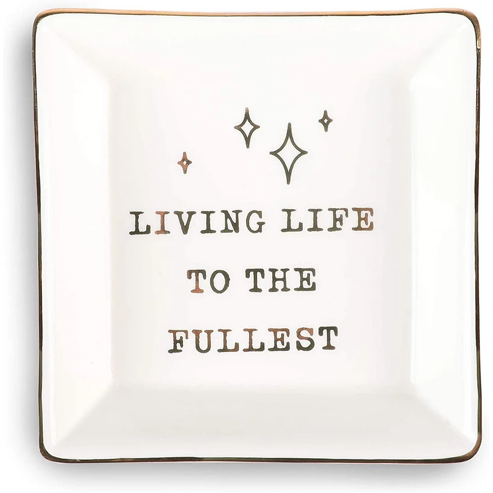 - JEWELRY DISH: Keep your necklaces, rings, earrings, and small knick knacks safe in this small trinket tray; the white tray reads “Living Life To The Fullest” will complement any home decor