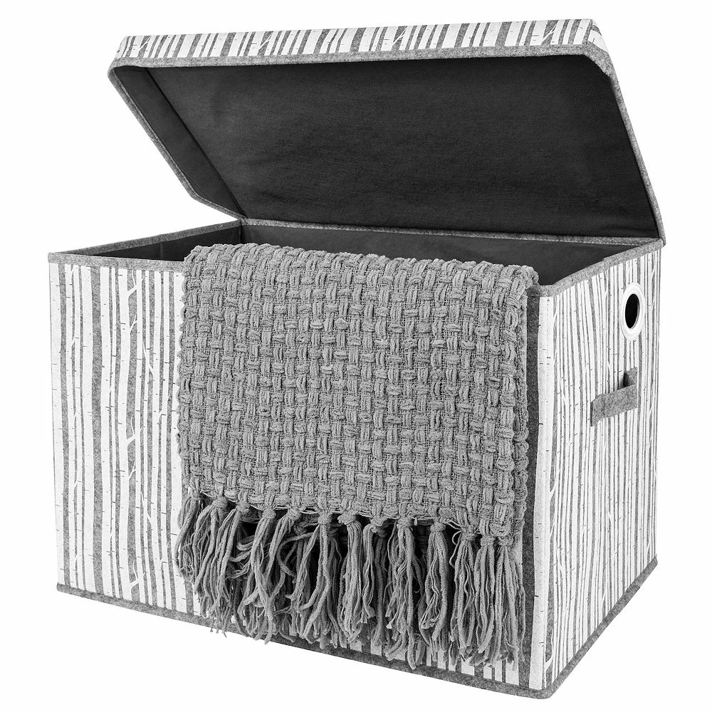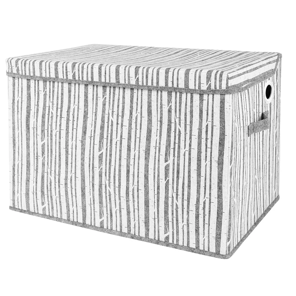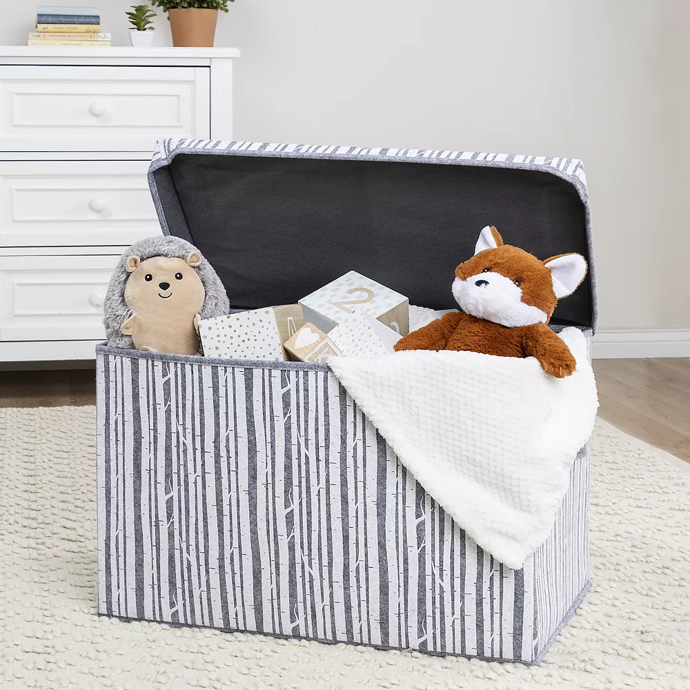 - The toy box features white birch print design on the exterior and a solid gray inner lining.