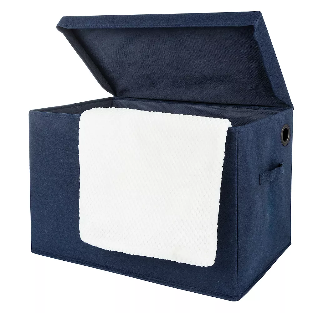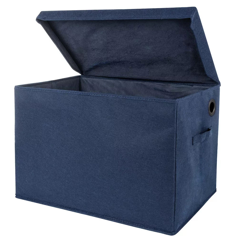 - The attached hinged lid features a tailored fold-over finish that brings an elevated elegance to this everyday storage bin.