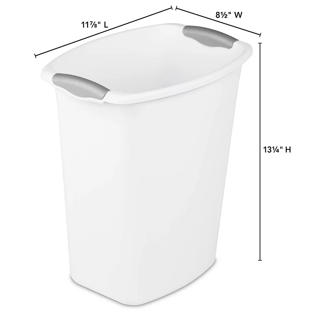 These wastebaskets offer an easy-to-clean textured surface with a modern design that holds a 3-gallon capacity. These wastebaskets also fit neatly under a desk or office to conceal any trash or debris and accommodate a standard plastic shopping bag. The overall dimensions of this item are 11 7/8 L x 8 1/2 W x 13 1/4 H.