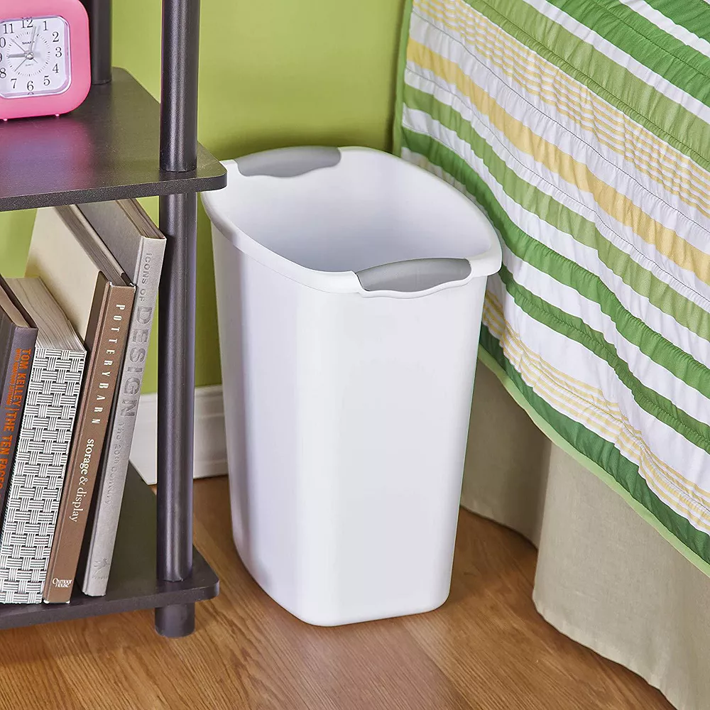 The 3 Gallon Wastebaskets feature a clean and simple design that coordinates with any home or office décor. The slim, rectangular shape make them item ideal for use in the bathroom, bedroom, office, craft room, kitchen or under the sink where narrow spaces require a space-efficient solution. Color-accented inserts and integrated handles allow for easy handling and transporting.