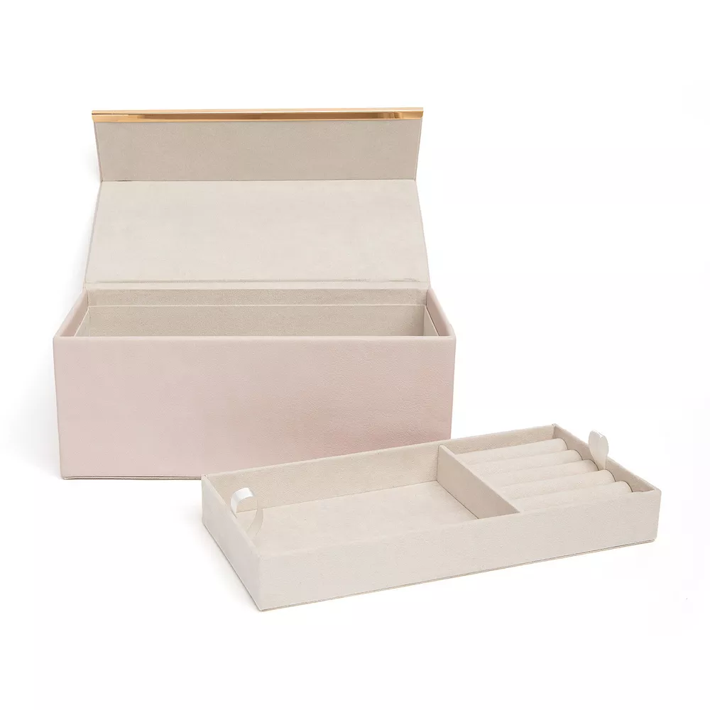 This beautiful West Emory jewelry box is perfect to sit on top of your vanity. Inside there are ring rolls and multiple compartments to store all your jewelry items. It is held shut with a hidden magnetic latch keeping the contents safe and secure.