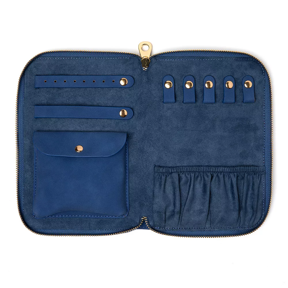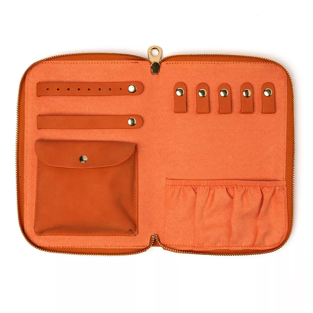 This slim and compact folio is the ideal travel companion. It features multiple ways to store all the essential jewelry items, a snap pocket, straps for earrings and rings, and necklace hooks.